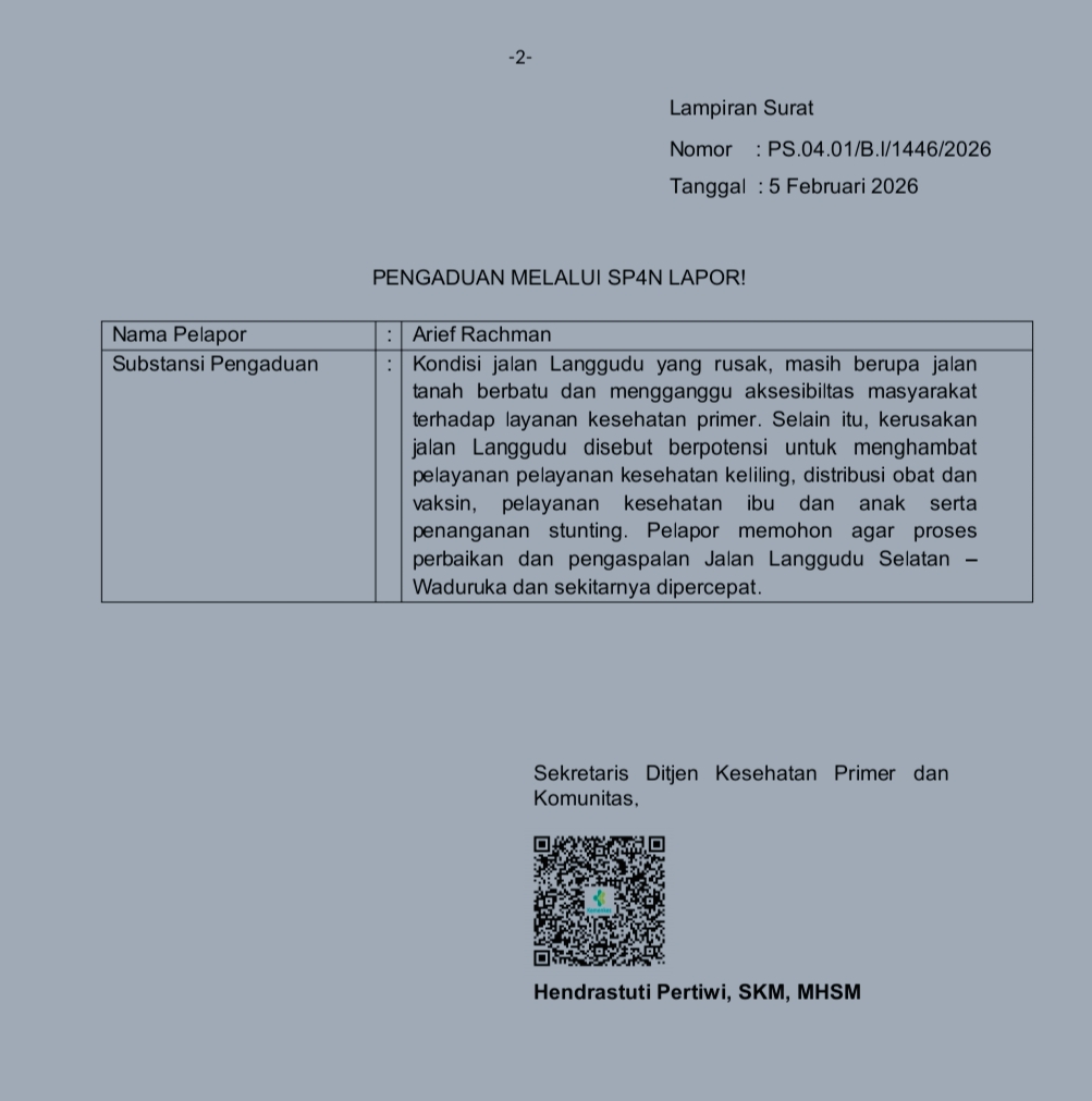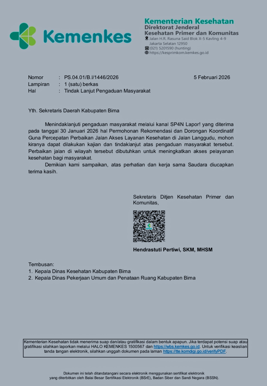 Kementerian Kesehatan Republik Indonesia melalui surat resmi tertanggal 5 Februari 2026 kepada Sekretaris Daerah Kabupaten Bima menindaklanjuti pengaduan masyarakat terkait akses jalan layanan kesehatan di Langgudu.