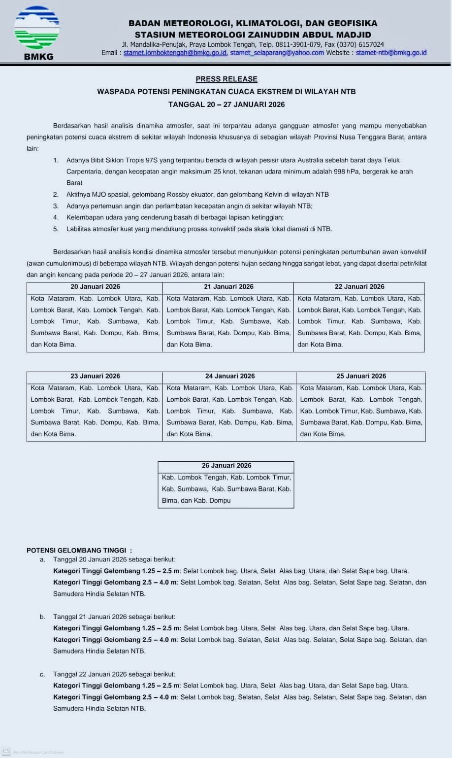 20-22 Januari 2026: Selat Lombok, Selat Alas, Selat Sape (1,25-2,5 m) dan Selat Lombok Selatan, Selat Alas Selatan, Selat Sape Selatan, serta Samudera Hindia Selatan NTB (2,5-4,0 m).