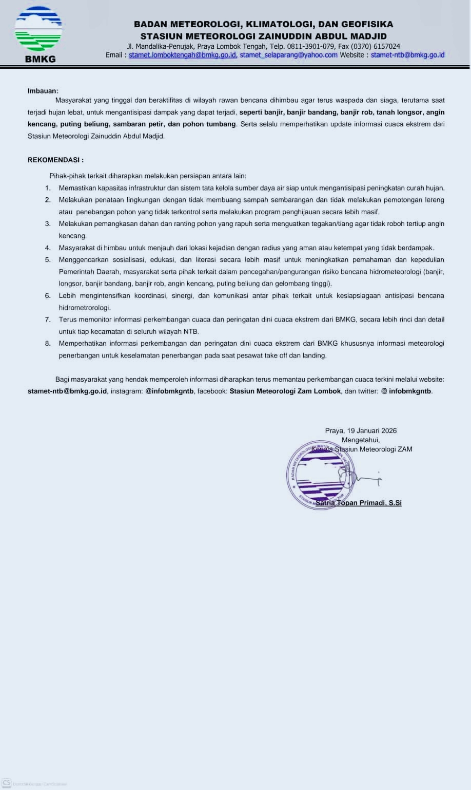 SUMBAWAPOST.com| Mataram- Kepala Stasiun Meteorologi ZAM, Satria Topan Primadi, mengingatkan masyarakat Nusa Tenggara Barat (NTB) untuk meningkatkan kewaspadaan menghadapi potensi cuaca ekstrem mulai 20 hingga 26 Januari 2026.