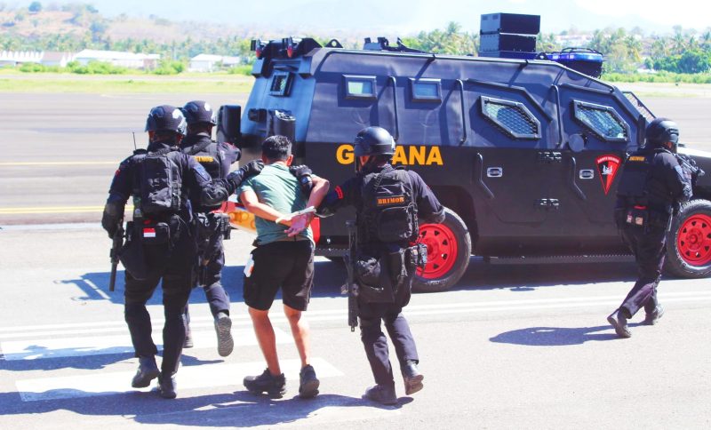SUMBAWAPost, Sumbawa – Patut diapresiasi, Anggota Brimob Polda Nusa Tenggara Barat (NTB) sigap dan cepat dalam menangani ancaman bom atau aksi teror dalam Simulasi Penanggulangan Keadaan Darurat (PKD), di Bandara Sultan Kaharuddin Sumbawa (SWQ).