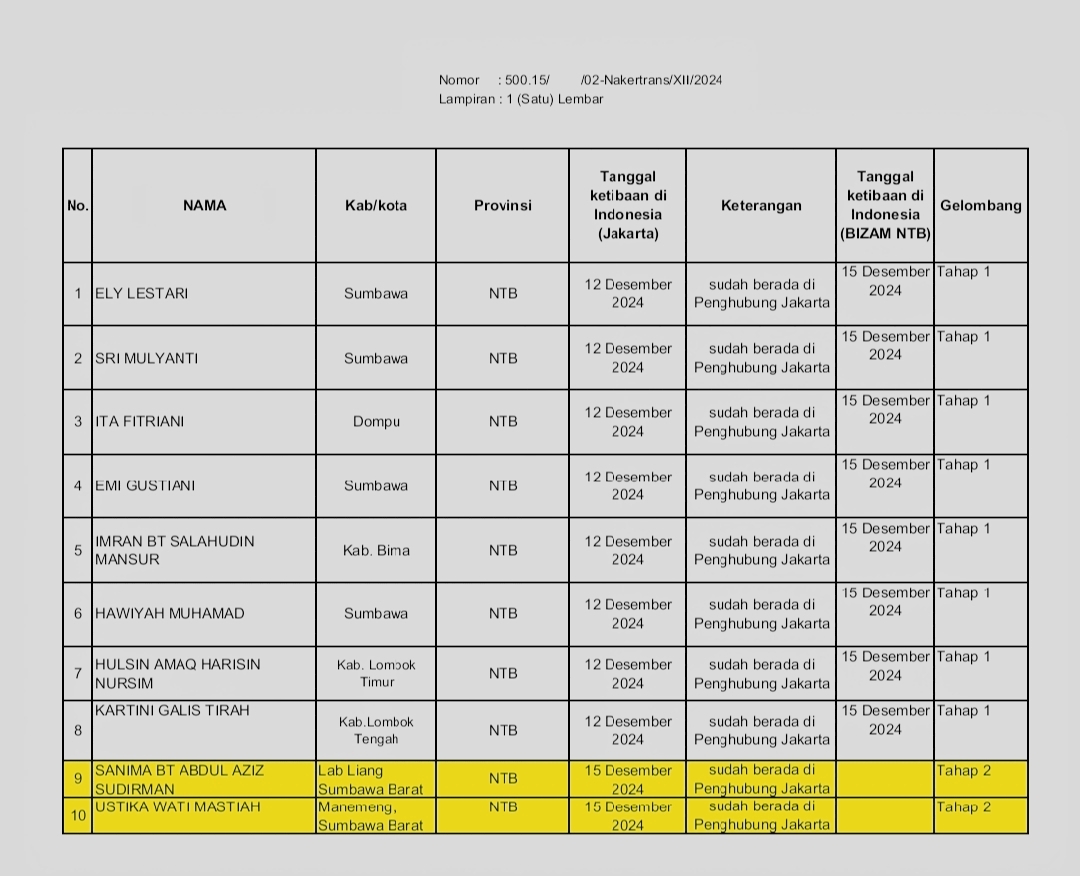 “Ada tambahan 2 orang. Yang 2 tambahan dipulangkan hari Senin 16 Desember 2024. Sementara 8 orang sebelumnya dipulangkan Hari minggu 15 Desember 2024 sudah tiba di lombok sekitar jam 12.30 atau jam 13.00. kami akan jemput di bandara dan rencananya