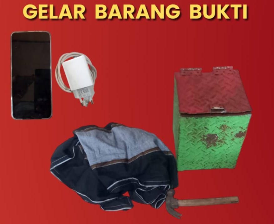 Barang bukti berupa kotak brankas, palu, dan ponsel hasil pembelian dengan uang curian telah diamankan. Kini, sang pencuri harus mempertanggungjawabkan perbuatannya di balik jeruji besi, terancam hukuman maksimal tujuh tahun penjara sesuai Pasal 362 KUHP.