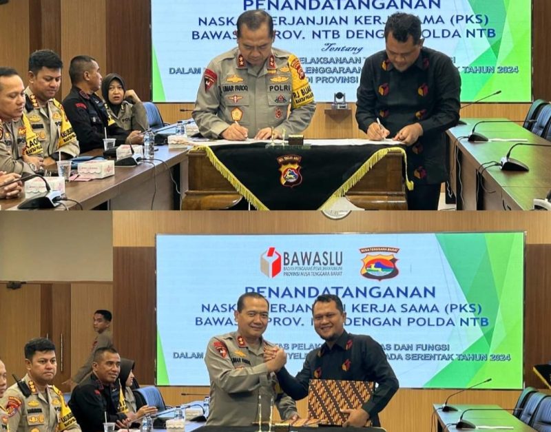 Kapolda NTB, Irjen Pol R. Umar Faroq, hadir langsung untuk menandatangani naskah perjanjian kerja sama tersebut, yang dirancang sebagai bentuk tindak lanjut antara Nota Kesepahaman Bersama (MoU) antara Bawaslu RI dan Polri tentang sinergitas pelaksanaan tugas dan fungsi pada Pemilu dan Pemilihan.