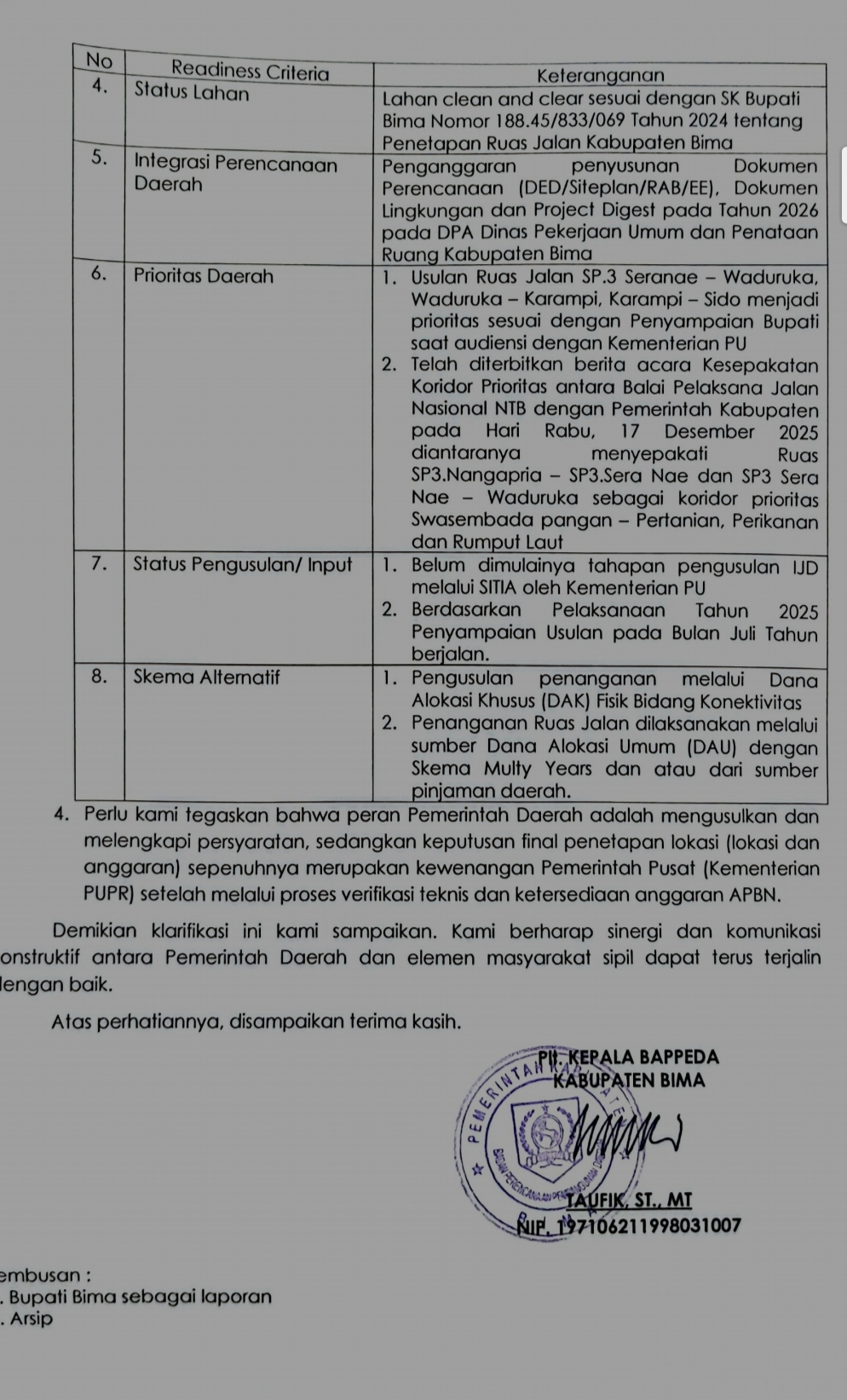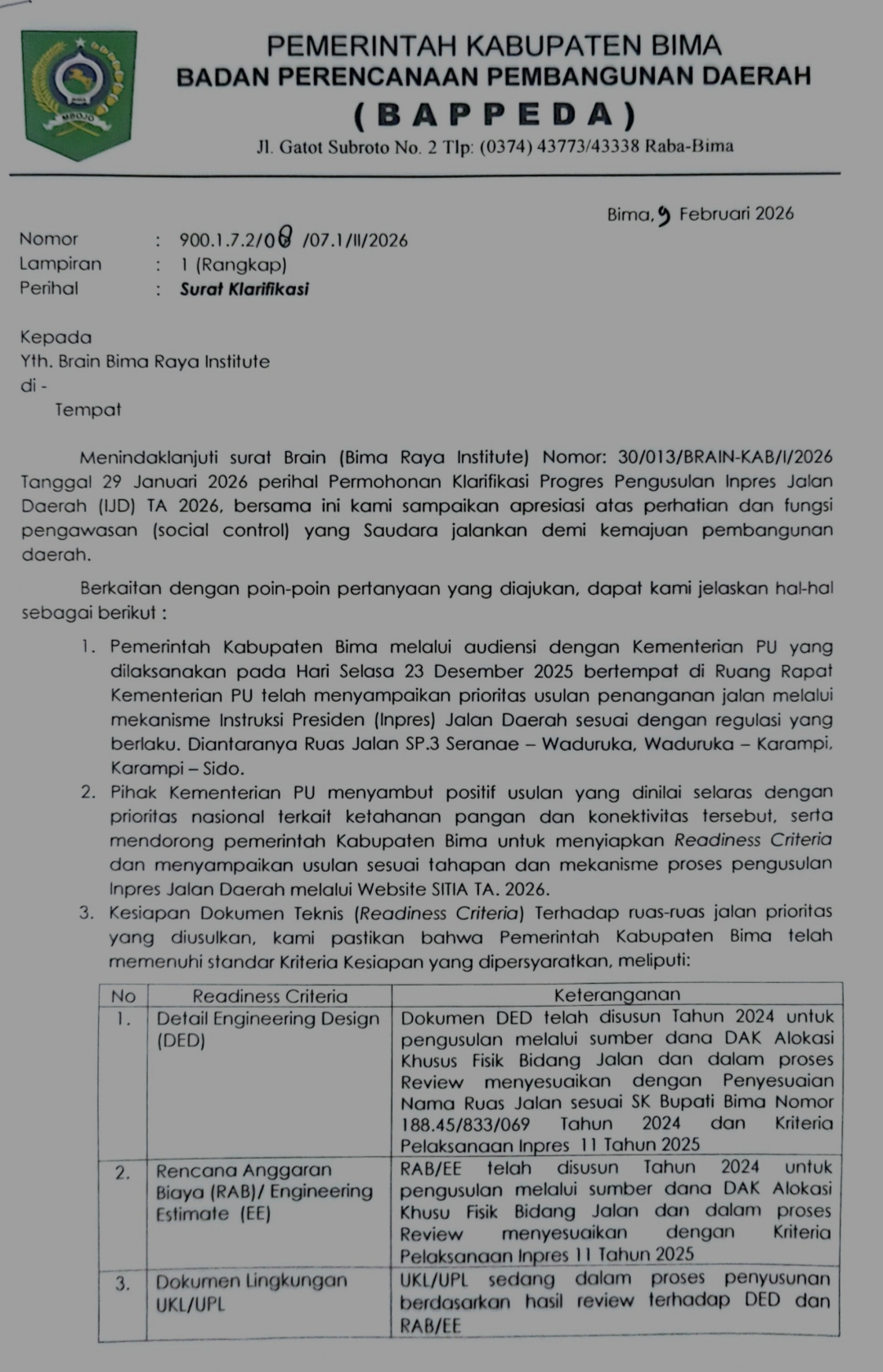 Melalui surat resmi bertanggal 4 Februari 2026, Kepala Bappeda Kabupaten Bima, Taufik ST., T, menyampaikan apresiasi atas perhatian dan fungsi pengawasan masyarakat sipil terhadap pembangunan daerah.