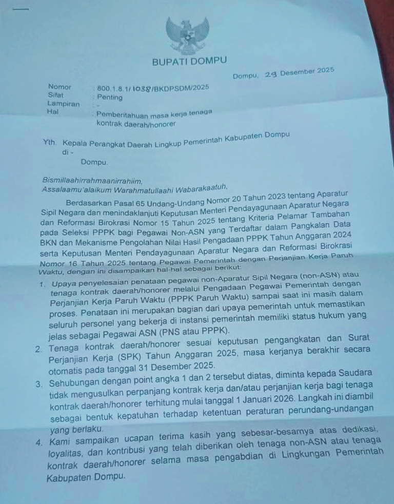 Di tengah polemik tersebut, beredar surat bernomor 800.1.8.1/1038/BKDPSDM/2025 tertanggal 29 Desember 2025 yang ditujukan kepada Kepala Perangkat Daerah di lingkup Pemerintah Kabupaten Dompu. Surat itu berisi pemberitahuan berakhirnya masa kerja tenaga kontrak daerah atau honorer per 31 Desember 2025 serta permintaan agar tidak mengusulkan perpanjangan kontrak mulai 1 Januari 2026.