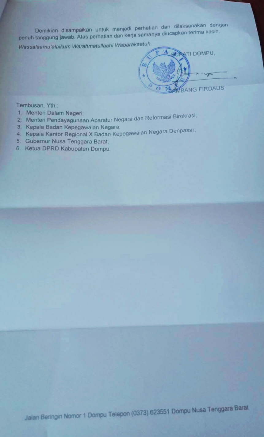 Dalam surat itu juga disampaikan ucapan terima kasih atas dedikasi dan pengabdian tenaga non-ASN selama bertugas di lingkungan Pemerintah Kabupaten Dompu.