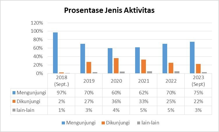 Rekapitulasi di facebook ini dilakukan sejak September 2018 misalnya tercatat 1963 kali kunjungan sebagai tahun dengan aktivitas tertinggi. Bila dibagi 12 bulan rata-rata 163 kali atau 5 kali pertemuan dalam sehari di tempat dan moment yang berbeda. Sementara tahun 2021-2022 tahun-tahun puncak wabah covid tahun-tahun terendah pertemuan yang hanya 600an kali. Atau 20 kali sebulan.