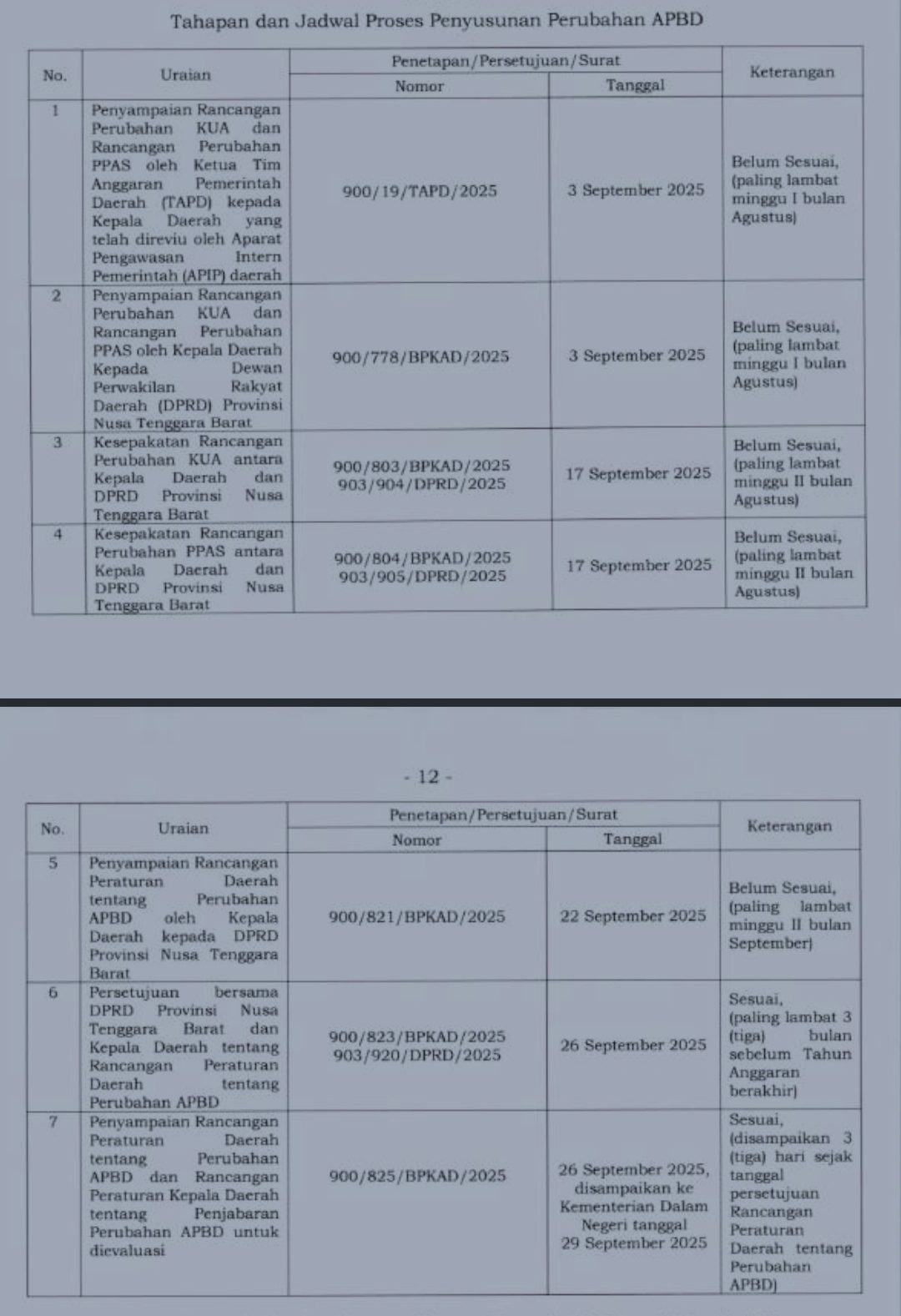 Dalam surat resmi bernomor 900.1.1.4/5504/Keuda 22 Oktober Tahun 2025, yang ditandatangani secara elektronik oleh Sekretaris Direktorat Jenderal Bina Keuangan Daerah, Dr. Drs. Horas Panjaitan, M.Ec.Dev, Kemendagri menilai bahwa tahapan dan jadwal penyusunan APBD Perubahan NTB 2025 belum sepenuhnya berpedoman pada ketentuan peraturan perundang-undangan.
