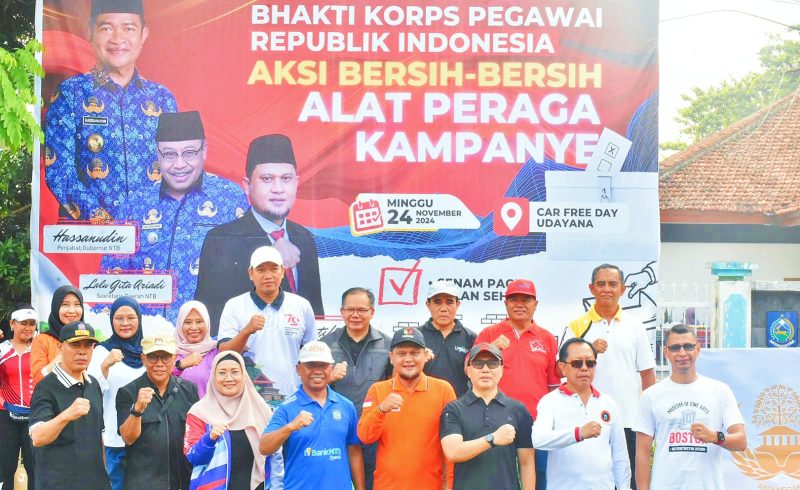 SUMBAWAPOST.com, Mataram-Memasuki tahapan masa tenang pemilihan kepala daerah, Pemerintah Provinsi Nusa Tenggara Barat melalui Korps Pegawai Republik Indonesia (Korpri), Badan Pengawas Pemilu (Bawaslu) dan Komisi Pemilihan Umum menggelar Aksi Bersih Bersih Alat Peraga Kampanye di kawasan Car Free Day jalan Udayana Mataram, Ahad dalam rangkaian HUT Korpri ke 53 dan HUT NTB ke 66. (24/11). Hadir pula para kepala OPD, Sekwan DPRD, para Direktur RS dan beberapa perwakilan Forkopimda bergerak bersama menyusuri jalan Udayana sampai ke bundaran lama dan menurunkan beberapa alat peraga seperti baliho dan stiker yang masih terpampang di sejumlah titik.