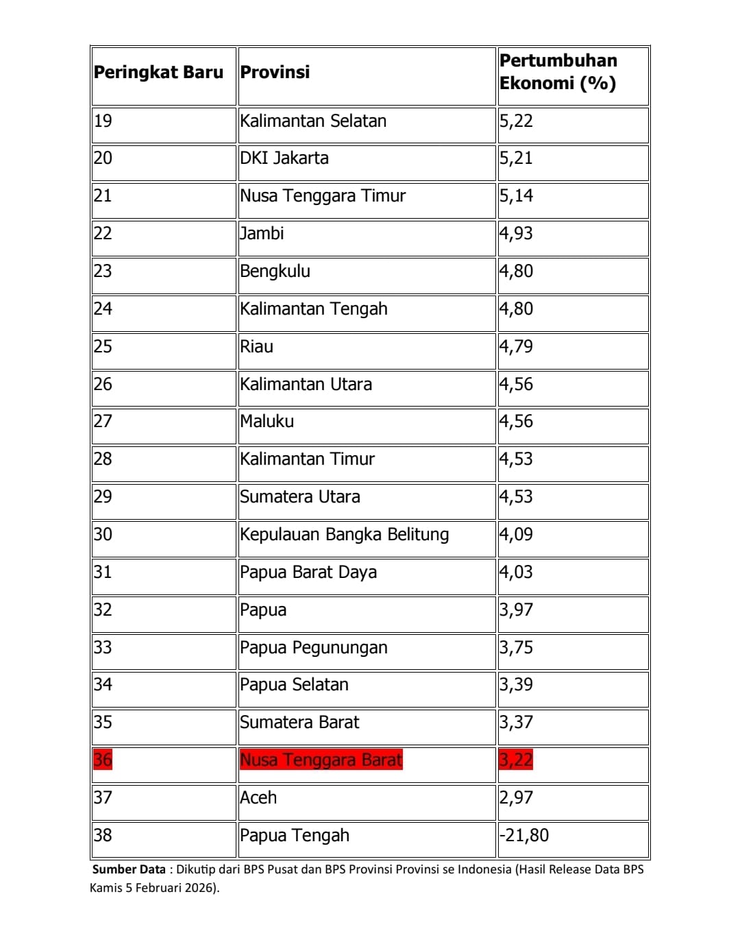 Namun, rilis Badan Pusat Statistik (BPS) pada 5 Februari 2026 kembali menghadirkan cermin yang jujur. Pertumbuhan ekonomi NTB tahun 2025 secara kumulatif (c-to-c) tercatat 3,22 persen, menempatkan daerah ini pada peringkat ke-36 dari 38 provinsi di Indonesia.