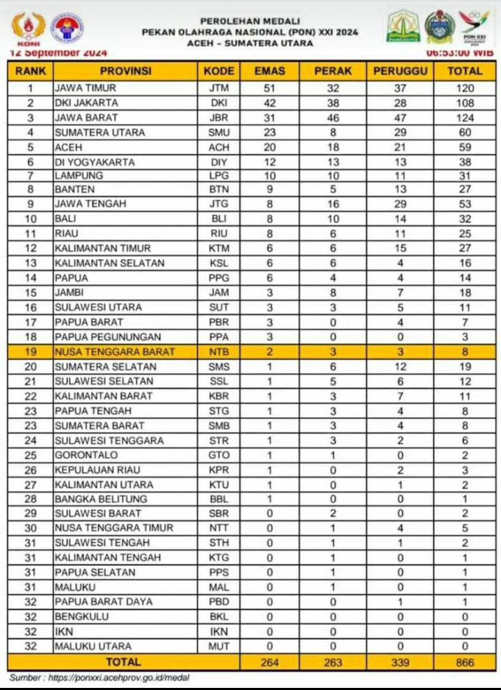 SUMBAWAPost.com, Banda Aceh- Peringkat klasemen sementara Kontingen Nusa Tenggara Barat di Pekan Olahraga Nasional (PON) XXI Aceh Sumut 2024 per Rabu 11 September 2024 naik ke peringkat 17 di urutan ke 19 Pasca raihan dua emas, tiga perak dan tiga perunggu,