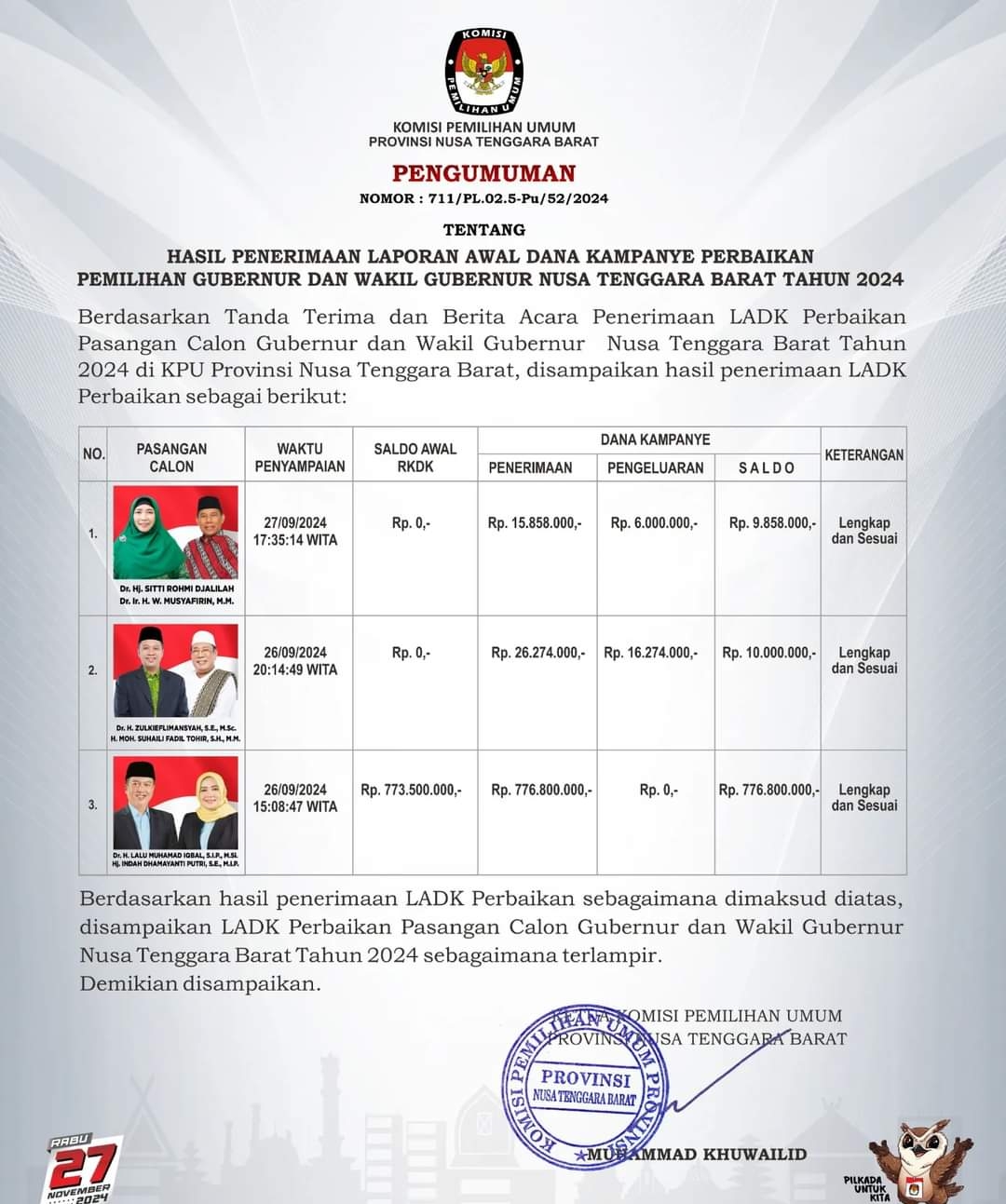 Dalam keterangan resmi yang ditanda tangani Ketua KPU NTB Muhammad Khuwailid dengan nomor surat: 711/PL.02.5.pu/52/2024, melalui Divisi Sosialisasi Pendidikan Pemilih, Parmas dan SDM KPU NTB menyampaikan, Komisi Pemilihan Umum (KPU) NTB menerima Laporan Awal Dana Kampanye Pemilihan Gubernur dan Wakil Gubernur Nusa Tenggara Barat Tahun 2024.