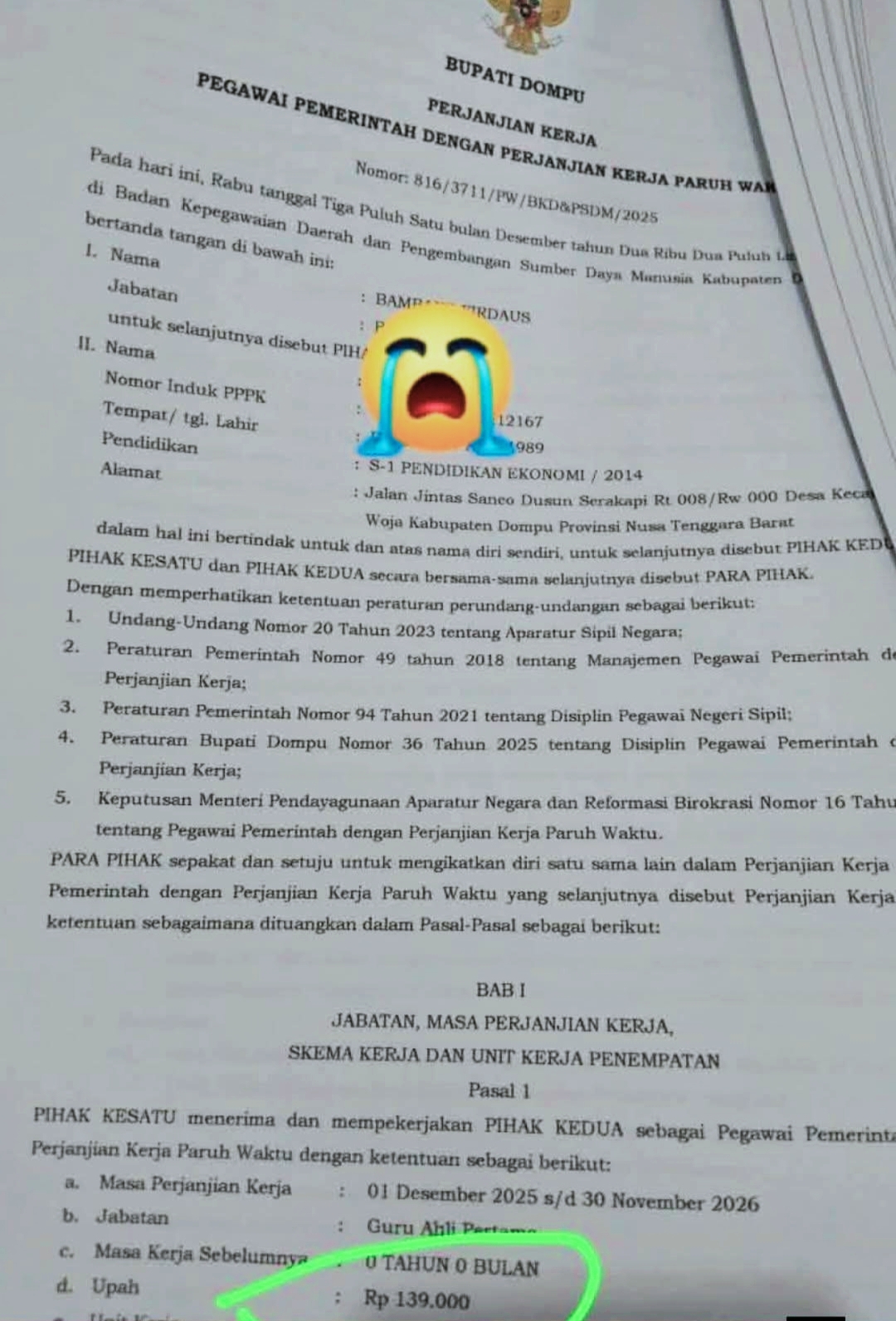 Usai penyerahan SK, Pemerintah Kabupaten Dompu menindaklanjuti pengangkatan tersebut dengan penandatanganan Perjanjian Kerja PPPK Paruh Waktu. Perjanjian ini tertuang dalam dokumen resmi Nomor: 816/9711/PW/BKDAPSDM/2025, yang ditandatangani pada 31 Desember 2025 di BKD dan PSDM Kabupaten Dompu.
